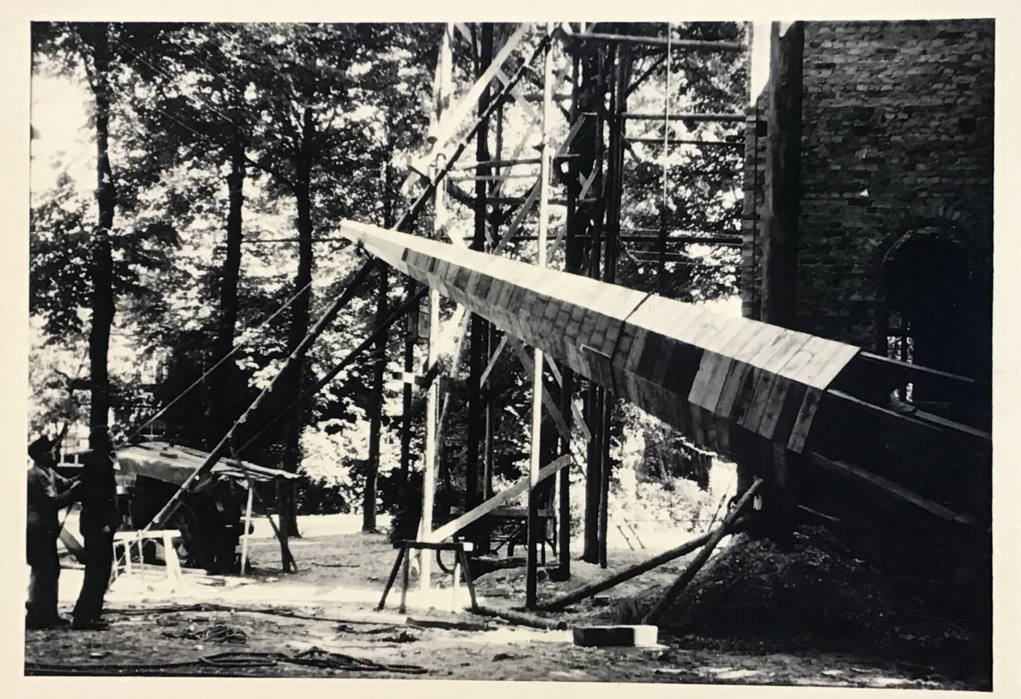 Im Juni 1952 wurde der im Jahre 1951 begonnene Kirchturmbau mit der Errichtung der Kirchturmspitze und der Anbringung der Glocken abgeschlossen. Dies ist der Turm, der auch heute noch das Erscheinungsbild der Kirche prägt.  Sie finden ausführlichere Informationen …  unter dem folgenden Link. Artikel – Kirchturmbau vor 70 Jahren