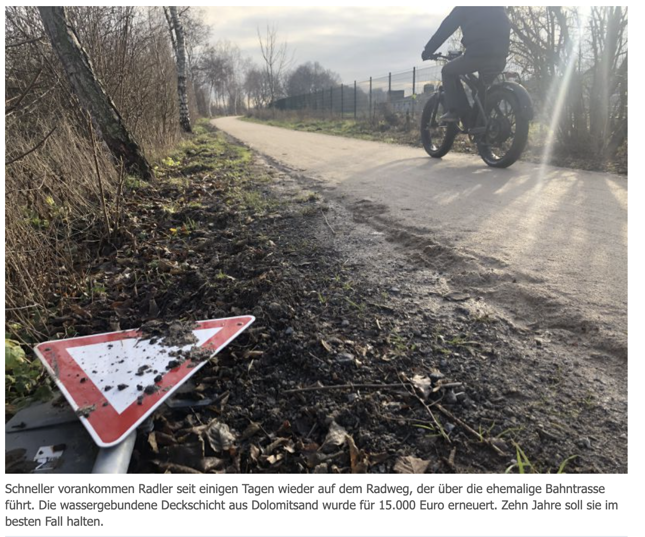 Mitte Dezember ist nach Auskunft der Rietberger Stadtverwaltung neuer Dolomitsand auf einem 1,1 Kilometer langen und 2,5 Meter breiten Teilstück des Fahrradwegs aufgebracht worden. Die Kosten für diese im Zuge der Wegeunterhaltung durchgeführte Maßnahme betragen demnach 15.000 Euro.