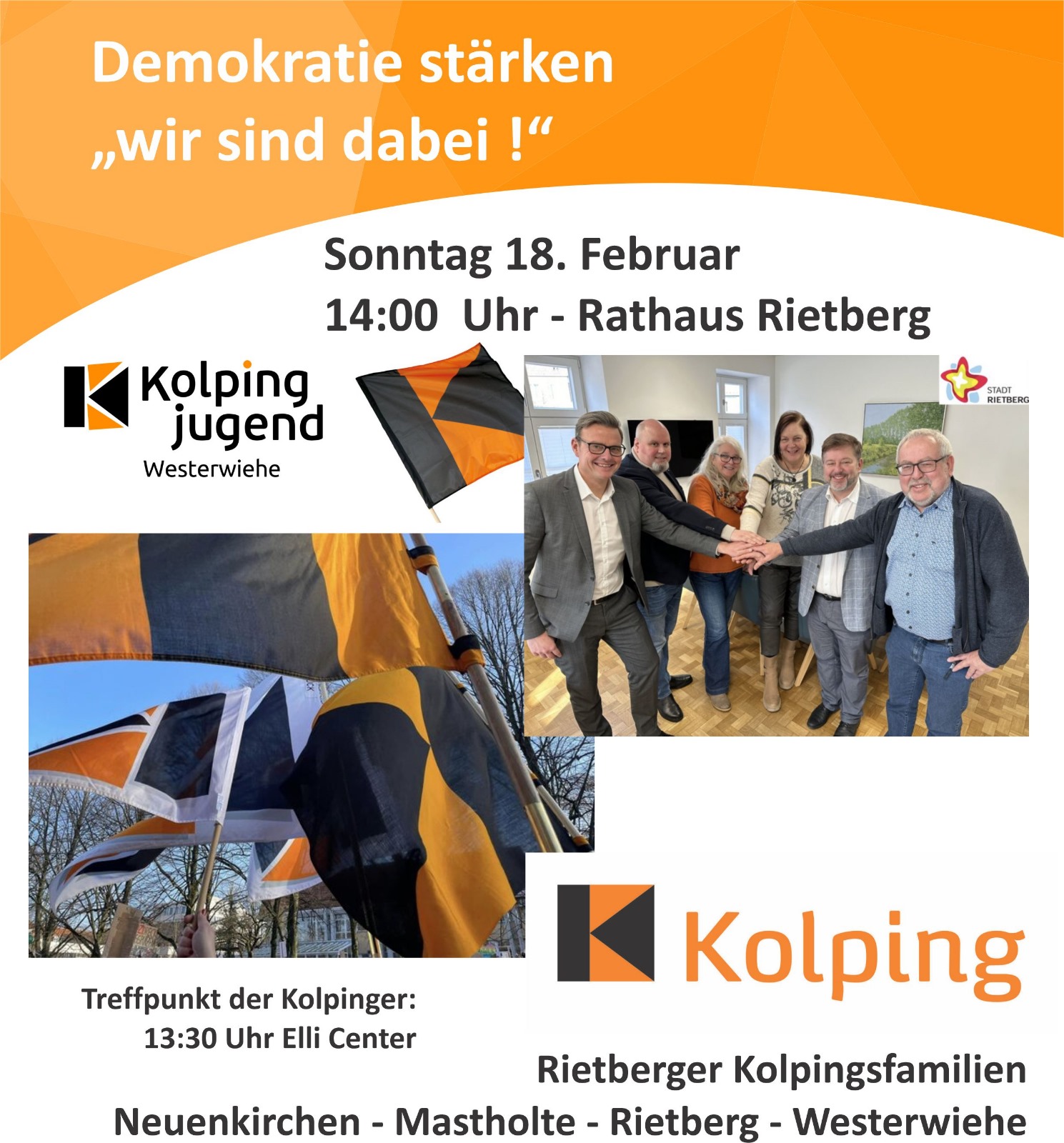 Die Rietberger Kolpingfamilie trifft  sich unter dem Motto „wir sind dabei“ am Sonntag, 18. Februar 2024 um 13:30 Uhr am Elli Center in Rietberg, um an dem Marsch für Demokratie (14:00 Uhr ab Rathaus Rietberg) teilzunehmen.