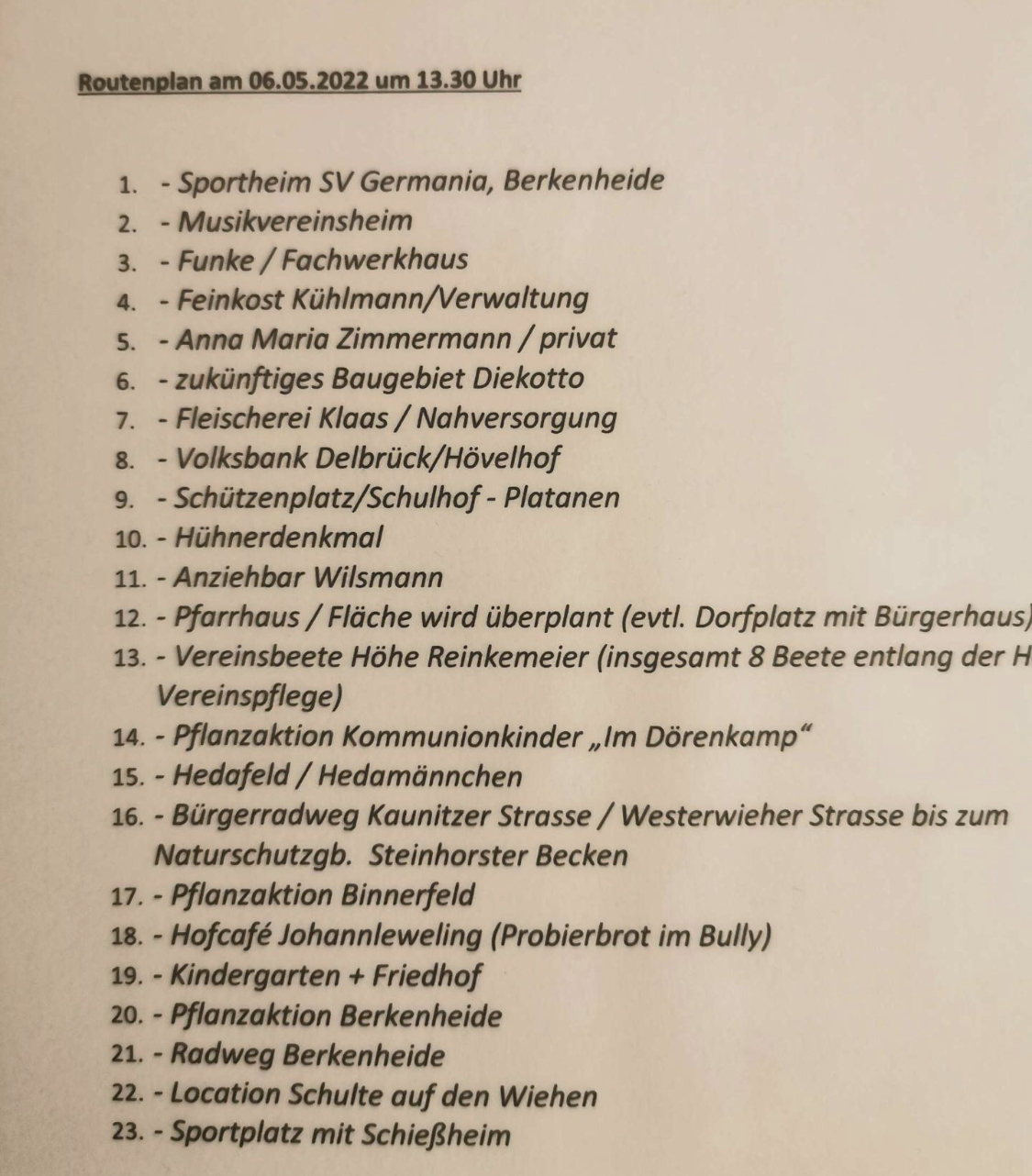 Nächste Woche Freitag, d.h. 06. Mai 2022, ist es soweit, schreibt unser Ortsvorsteher Detlev Hanemann im DorfFunk. An diesem Tag kommt die Kommission zum Dorfwettbewerb „Unser Dorf hat Zukunft“. Um 13:30 Uhr geht es los in der Berkenheide SV Germania. Ich hoffe, dass viele Westerwieher Bürger und Bürgerinnen daran teilnehmen unser Dorf zu präsentieren. Anbei findet ihr die Marschroute.