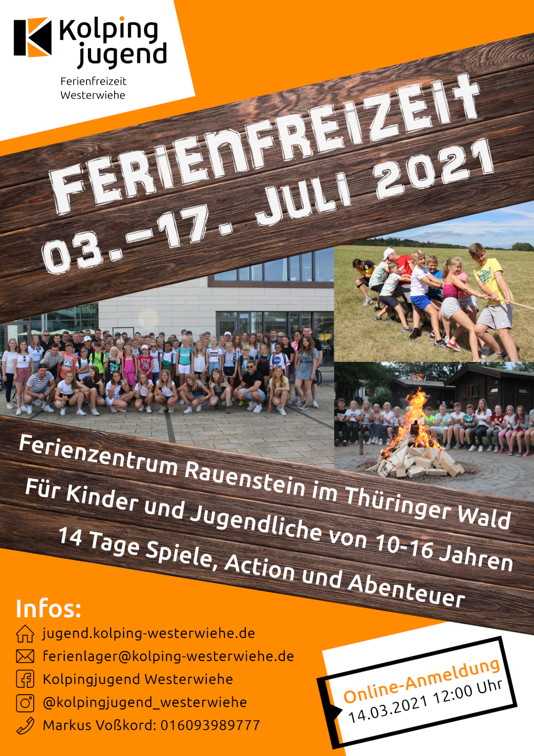 Aufgrund der aktuell geltenden Regelungen wollen wir unsere Anmeldung rein digital durchführen. Auf unserer Homepage www.jugend.kolping-westerwiehe.de finden Sie die Informationen zum Ferienzentrum mit einigen Fotos von unserer Besichtigung.