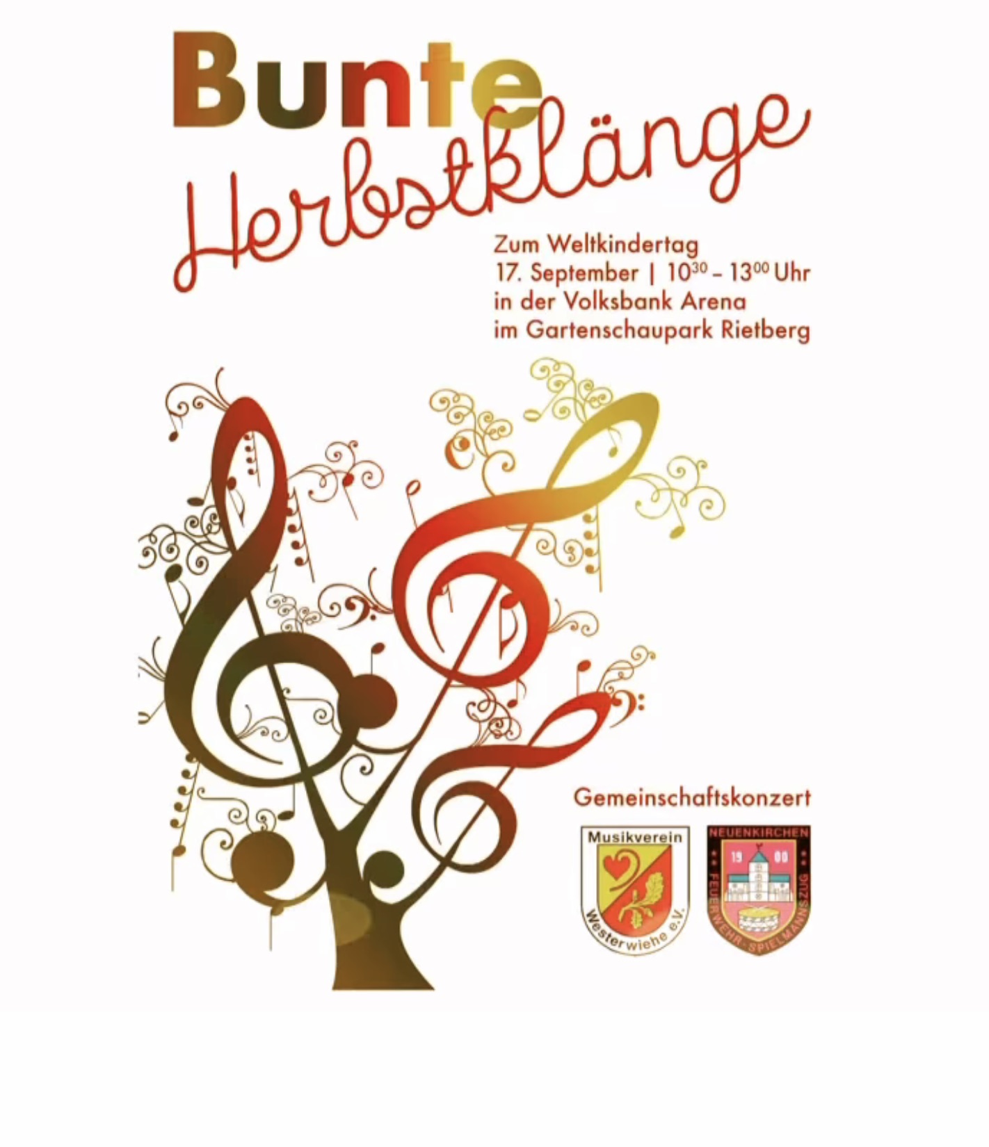 Ein Gemeinschaftskonzert mit dem Musikverein Westerwiehe und dem Feuerwehrspielmannszug Neuenkirchen findet am Weltkindertag, Sonntag, 17. September 2023 in der Volksbank Arena im Gartenschaupark statt. Die Musiker und Musikerinnen zeigen ihr Können von 10:00 bis 13:00 Uhr.