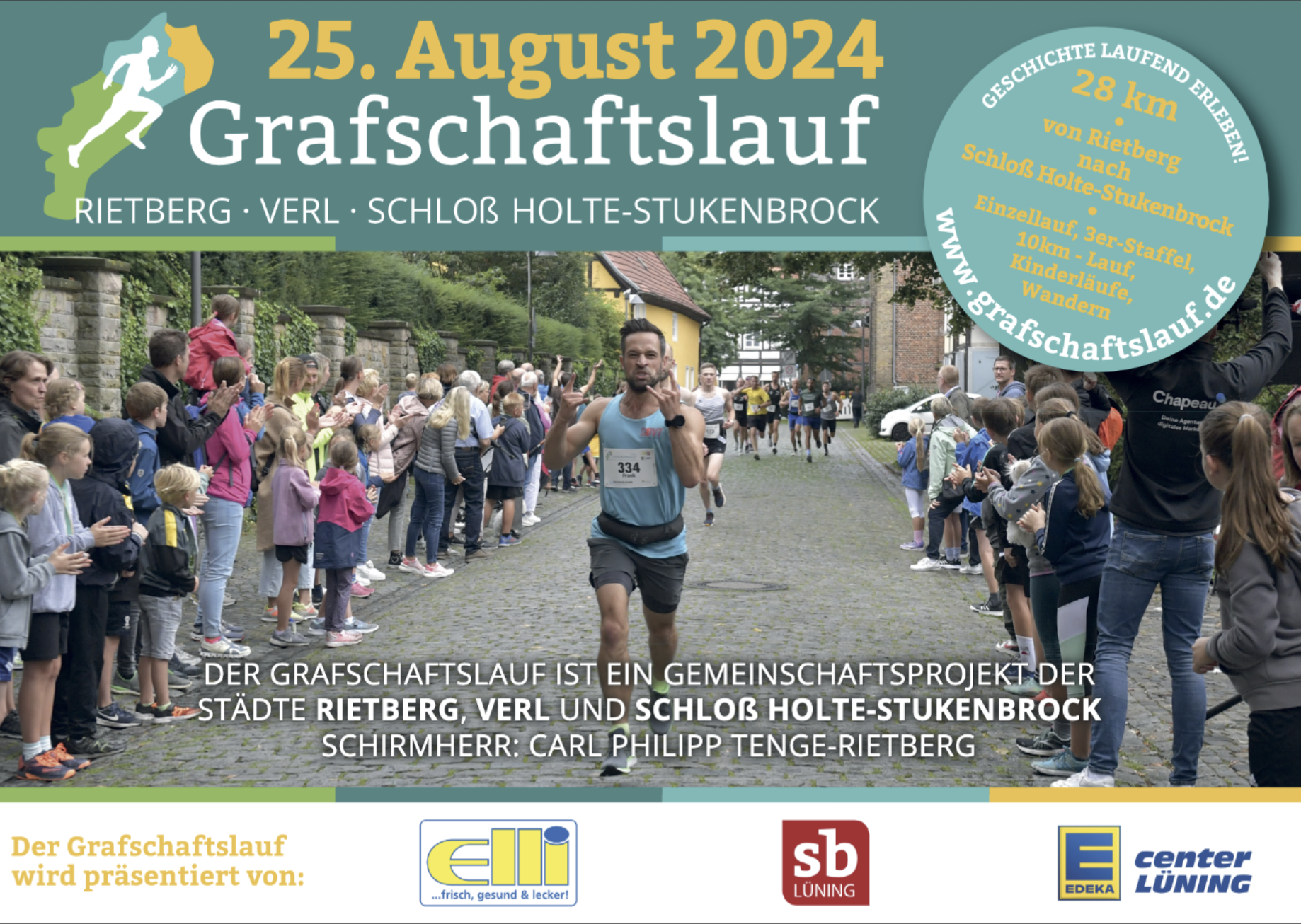 Der Grafschaftslauf 2024 verbindet die drei, für die damalige Grafschaft Rietberg bedeutenden, Städte Rietberg, Verl und Schloß Holte-Stukenbrock miteinander. Gemeinsam wollen wir die historisch so bedeutsame Geschichte ein wenig aufleben lassen und „laufend Geschichte erleben“. Gestartet wird am Gut Rietberg, wo früher das Schloss Rietberg stand. Nach Passieren der prachtvollen Schloßstraße geht es direkt in die Rietberger Innenstadt vorbei am Rathaus und dem Haus Münte weiter entlang der Ems bis zum Gartenschaugelände. Das erste Stimmungsnest erwartet die Läufer in Westerwiehe, hier ist auch der erste Staffelwechsel.