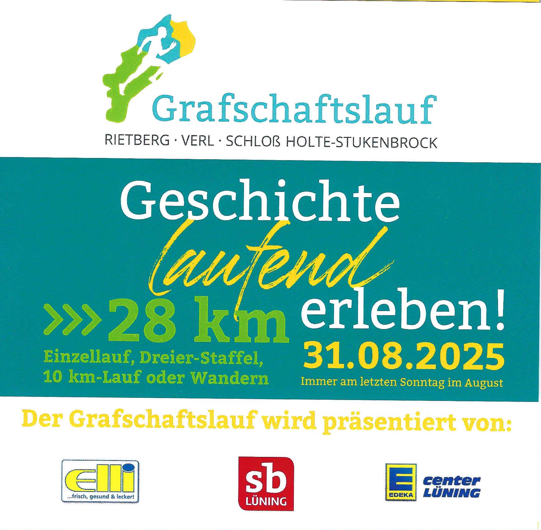 Der Grafschaftslauf verbindet die drei, für die damalige Grafschaft Rietberg bedeutenden, Städte Rietberg, Verl und Schloß Holte-Stukenbrock miteinander. Gemeinsam wollen wir die historisch so bedeutsame Geschichte ein wenig aufleben lassen und „laufend Geschichte erleben“. Gestartet wird am Gut Rietberg, wo früher das Schloss Rietberg stand.