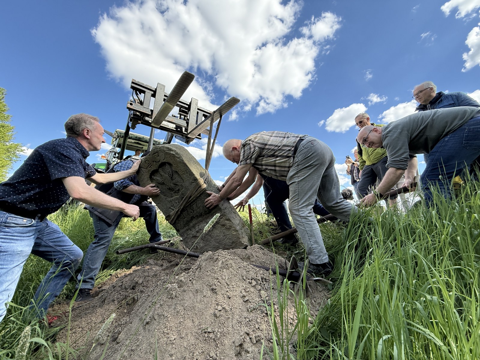 Das Loch für den Fuß des Quaders hatten die Heimatfreunde schon vorher ausgehoben. Finanziell unterstützt wurde die Versetzung des Grenzsteins von der Volksbank Delbrück-Rietberg.