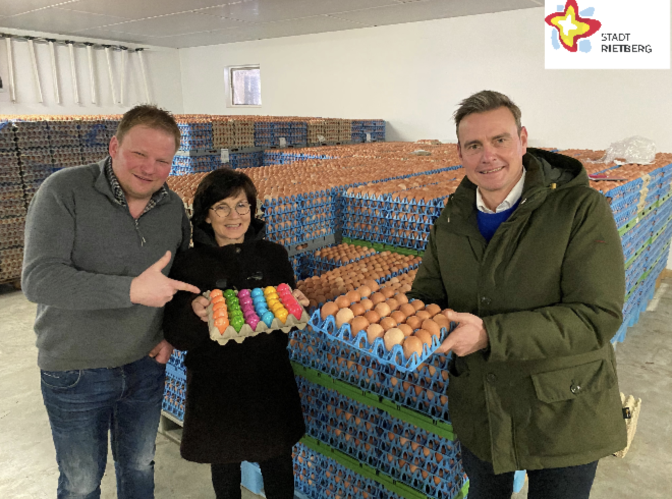 Spezialist für das Verpacken von Eiern ist die Firma OWi Ei aus Westerwiehe. Inhaber Thomas Determeyer (links) hat kürzlich in neue Maschinen und Automatisierungstechnik investiert. Das haben sich Renate Pörtner (Wirtschaftsförderin) und Bürgermeister Andreas Sunder vor Ort angeschaut. Foto: Stadt RietbergSpezialist für das Verpacken von Eiern ist die Firma OWi Ei aus Westerwiehe. Inhaber Thomas Determeyer (links) hat kürzlich in neue Maschinen und Automatisierungstechnik investiert. Das haben sich Renate Pörtner (Wirtschaftsförderin) und Bürgermeister Andreas Sunder vor Ort angeschaut. Foto: Stadt RietbergmSpezialist für das Verpacken von Eiern ist die Firma OWi Ei aus Westerwiehe. Inhaber Thomas Determeyer (links) hat kürzlich in neue Maschinen und Automatisierungstechnik investiert. Das haben sich Renate Pörtner (Wirtschaftsförderin) und Bürgermeister Andreas Sunder vor Ort angeschaut. Foto: Stadt RietbergSpezialist für das Verpacken von Eiern ist die Firma OWi Ei aus Westerwiehe. Inhaber Thomas Determeyer (links) hat kürzlich in neue Maschinen und Automatisierungstechnik investiert. Das haben sich Renate Pörtner (Wirtschaftsförderin) und Bürgermeister Andreas Sunder vor Ort angeschaut. Foto: Stadt RietbergMehrere Paletten gleichzeitig werden nun automatisch in die Sortiermaschine verfrachtet. Über einen Barcode kann jedes einzelne Ei bis zum Erzeuger nachverfolgt werden. Das funktioniert alles mit eigens programmierter Software, die dem Betrieb mit 50 Mitarbeiterinnen und Mitarbeitern effizientes Arbeiten ermöglicht. „Diese Investition hat sich definitiv gelohnt“, betont Thomas Determeyer. Bürgermeister Andreas Sunder hat sich jetzt gemeinsam mit der städtischen Wirtschaftsförderin Renate Pörtner den Betrieb angesehen und den Weg der Eier von der Anlieferung bis in den Karton verfolgt.