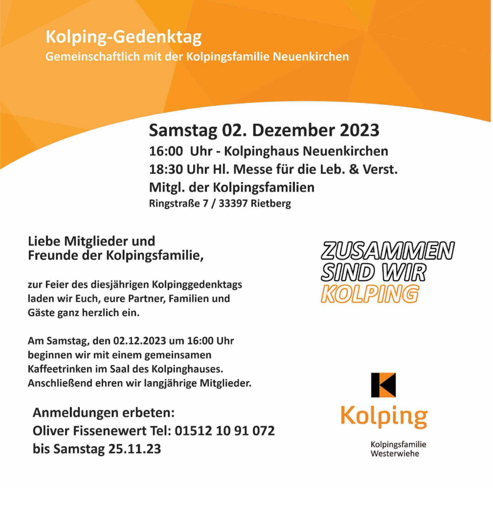 Ein Kolping-Gedenktag, gemeinschaftlich mit der Kolpingsfamilie Neuenkirchen findet am Samstag, 02. Dezember 2023 ab 16:00 Uhr im Kolpinghaus Neuenkirchen statt.Um Anmeldungen bis zum Samstag, 25.11.2023 bei Oliver Fissenewert 01512 10 91 072 wird gebeten.