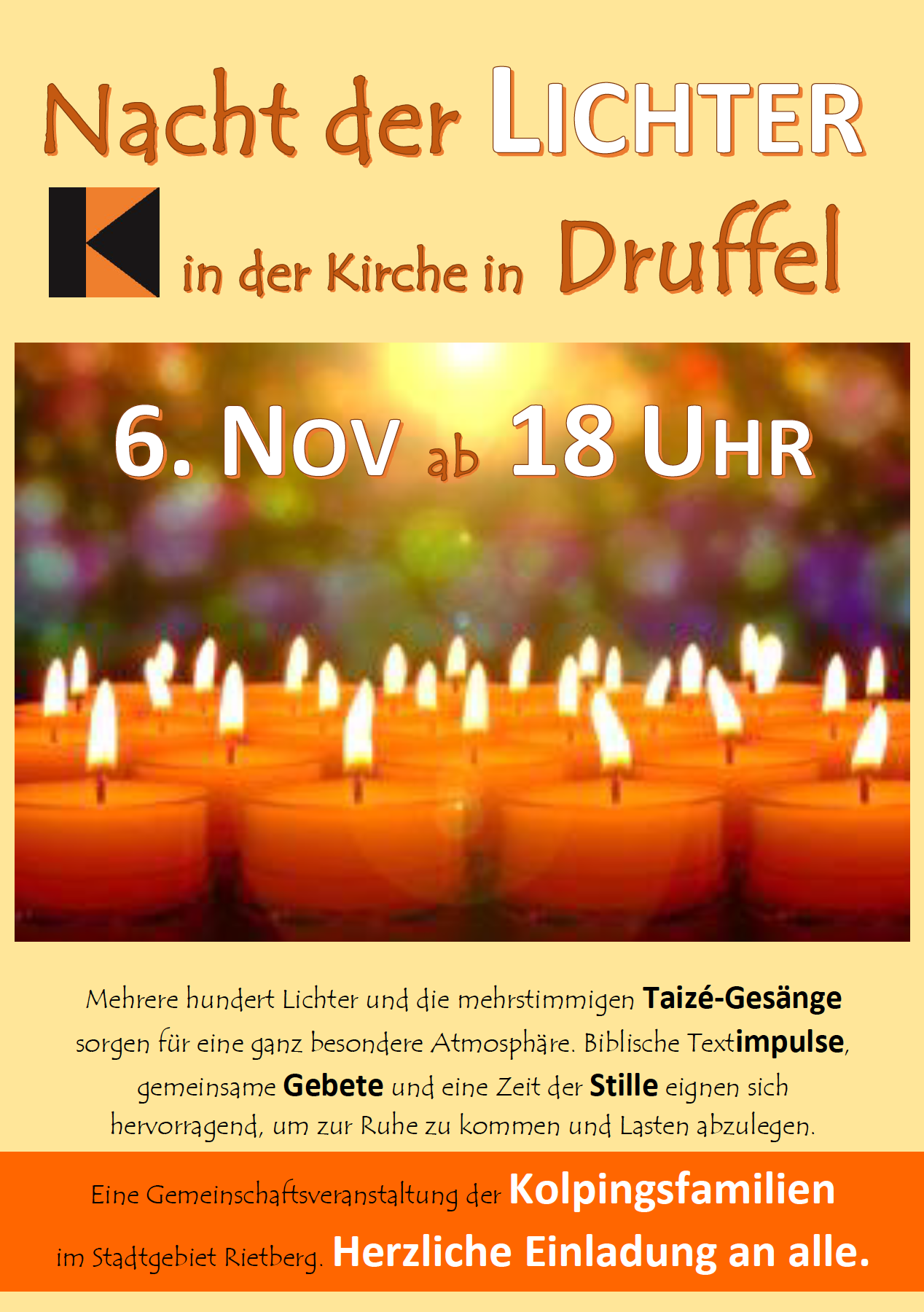 Mehrere hundert Lichter und die mehrstimmigen Taizé-Gesänge sorgen für eine ganz besondere Atmosphäre. Biblische Textimpulse, gemeinsame Gebete und eine Zeit der Stille eignen sich hervorragend, um zur Ruhe zu kommen und Lasten abzulegen. Diese Veranstaltung haben alle Kolpingfamilien im Stadtgebiet Rietberg organisiert – wir freuen uns über zahlreiche Teilnahme.