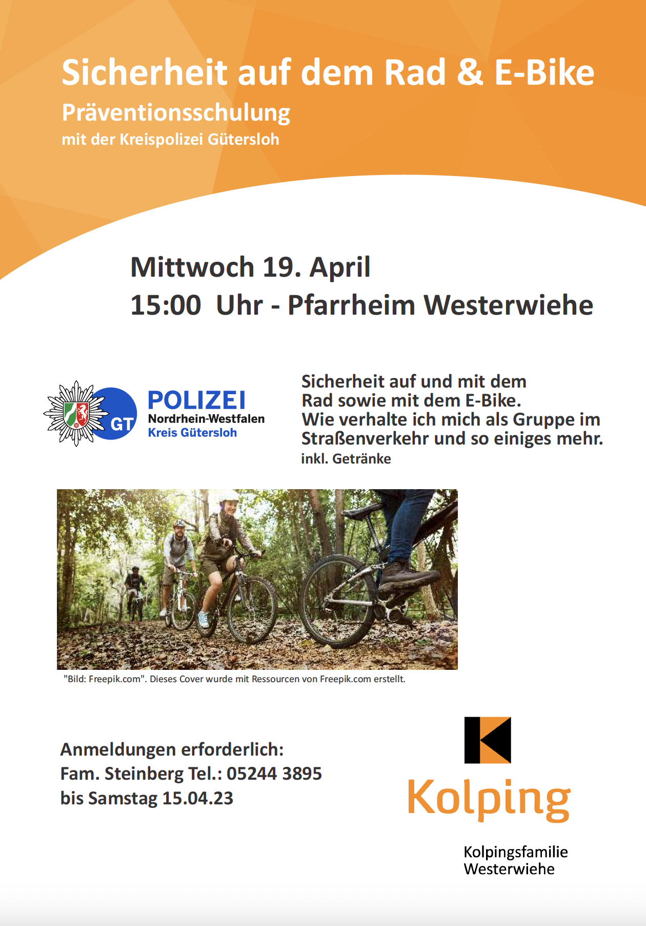 Vor dem Start der Radsaison bietet die Kolpingsfamilie Westerwiehe eine Präventionsschulung mit der Kreispolizei Gütersloh an. Am Mittwoch, 19. April, geht es ab 15:00 Uhr um die Sicherheit auf und mit dem Rad, sowie mit dem E-Bike. Unter anderem wird die Frage beantwortet, wie man sich als Gruppe im Strassenverkehr richtig verhält. Treffpunkt ist das Pfarrheim. Anmeldungen nimmt bis 15. April Familie Steinberg, 05244/3895, entgegen. Auch Nichtmitglieder sind willkommen.
