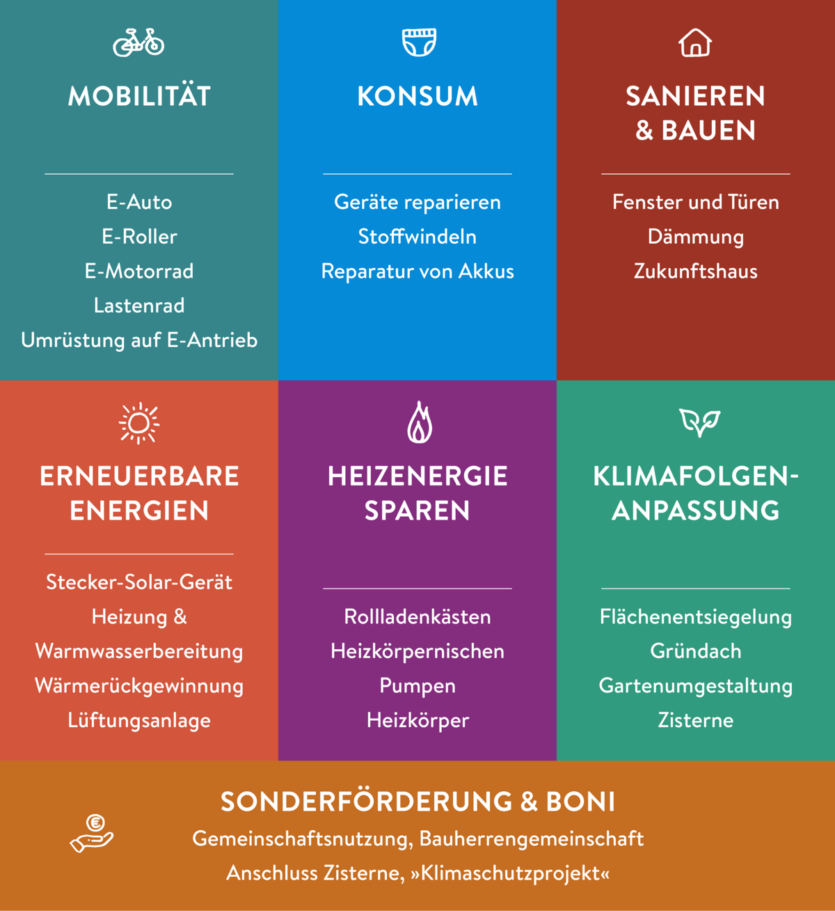 Neue Maßnahmen sind die Umrüstung von Autos mit Verbrennermotor auf Elektroantrieb, die Reparatur von Kleingeräten, Maßnahmen zur Einsparung von Heizenergie (zum Beispiel die Dämmung von Rollladenkästen, Heiznischen und Armaturen, gesetzlich vorgeschriebene Maßnahmen werden jedoch nicht gefördert) sowie die Übernahme von Kosten zum Weiterbetrieb von Photovoltaikanlagen (ausgenommen der Batteriespeicher). Nicht mehr gefördert werden die Anschaffung von Photovoltaik-Aufdach-Anlagen, von E-Bikes und von Biomasse- oder Holz-Heizungen.
