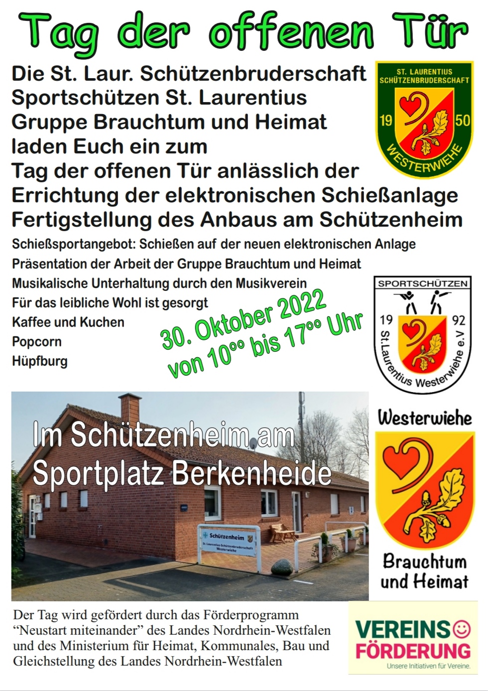 Nach der Fertigstellung des Anbaus am Schützenheim, freuen wir Schützen Westerwiehe uns auf ein Tag der offenen Tür. Fürs leibliche Wohl ist gesorgt und der Westerwieher Musikverein sorgt für musikalische Unterhaltung. Eine Hüpfburg steht für die kleinen bereit. Kommt vorbei wir freuen uns auf Euch.