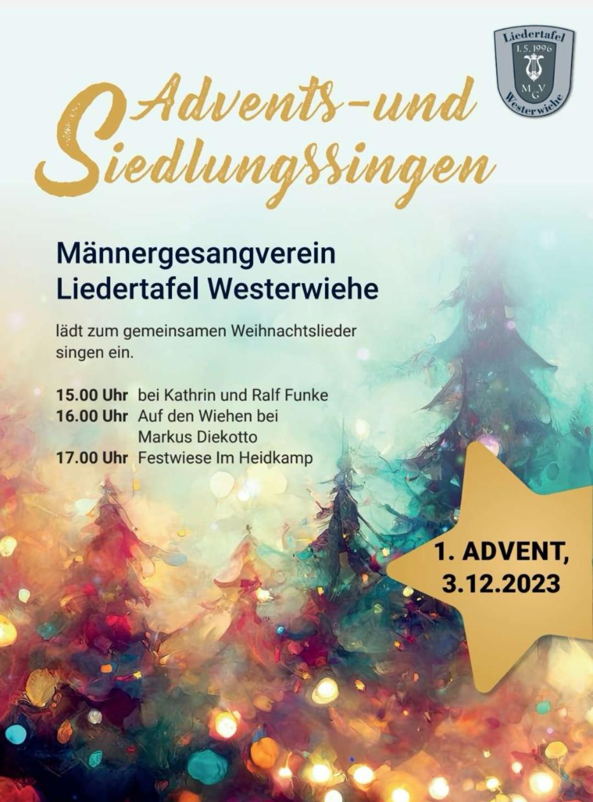 Der Männergesangverein Liedertafel Westerwiehe lädt am 1. Advent, 03.12.2023, zum gemeinsamen Weihnachtsliedsingen ein.