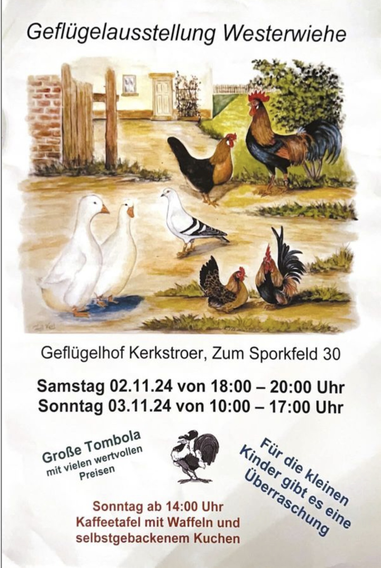 Der Rassegeflügelzuchtverein Westerwiehe führt am Samstag, den 02.November 2024 und am Sonntag, den 03.November 2024 zusammen mit den Zuchtfreunden der Edelzucht Neuenkirchen in den Fertigungshallen der Firma Kerkstroer, zum Sporkfeld 30, Rietberg seine diesjährige Lokalschau durch.