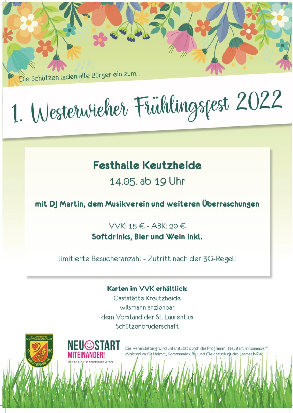 Aus dem Winterfest wird ein Frühlingsfest! Am Samstag den 14. Mai 2022 findet das 1. Westerwieher Frühlingsfest ab 19 Uhr in der Festhalle Kreutzheide für alle Westerwieher Bürger statt. Karten können im VVK, sowie an der Abendkasse, erworben werden (Teilnehmer begrenzt). Die bereits erworbenen Eintrittskarten für das Winterfest behalten weiterhin ihre Gültigkeit. Gemeinsam mit dem Musikverein Westerwiehe und DJ Martin wollen wir ein paar schöne Stunden verbringen. Getränke (Bier, Wein, Softdrinks) sind in den Kartenpreisen enthalten. Für Schützenbrüder und Schützenschwestern dürfen gerne in Uniform teilnehmen.