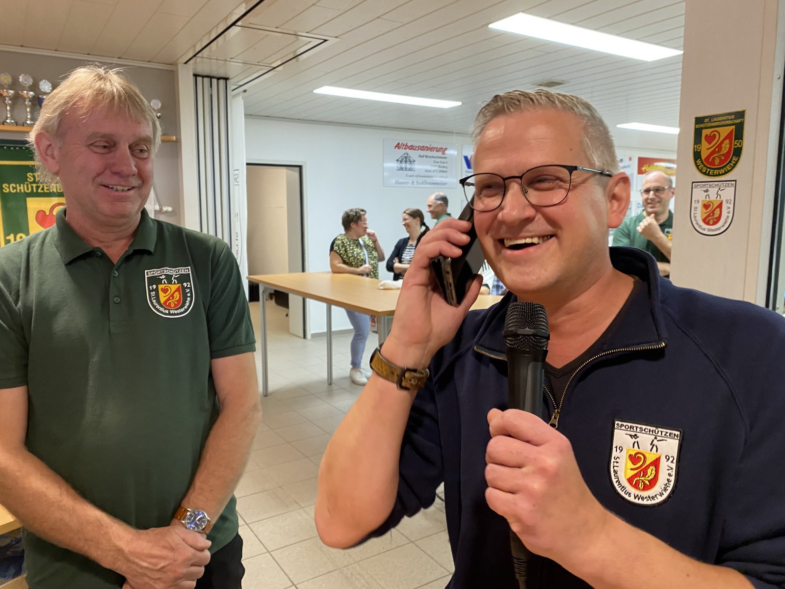 Grüße aus der Kur übersandte Brudermeister und Ortsvorsteher Detlev Hanemann. Der Westerwieher Schützenchef wurde aus der Kurklinik, in der er sich zurzeit von einer Operation erholt, telefonisch zugeschaltet. Seine Botschaft an alle am Bau Beteiligten: „Klasse gemacht.“ Den Anbau bezeichnete er als eine „Meisterleistung“, die allen Abteilungen der im Jahr 1950 gegründeten Schützenbruderschaft zugutekomme.