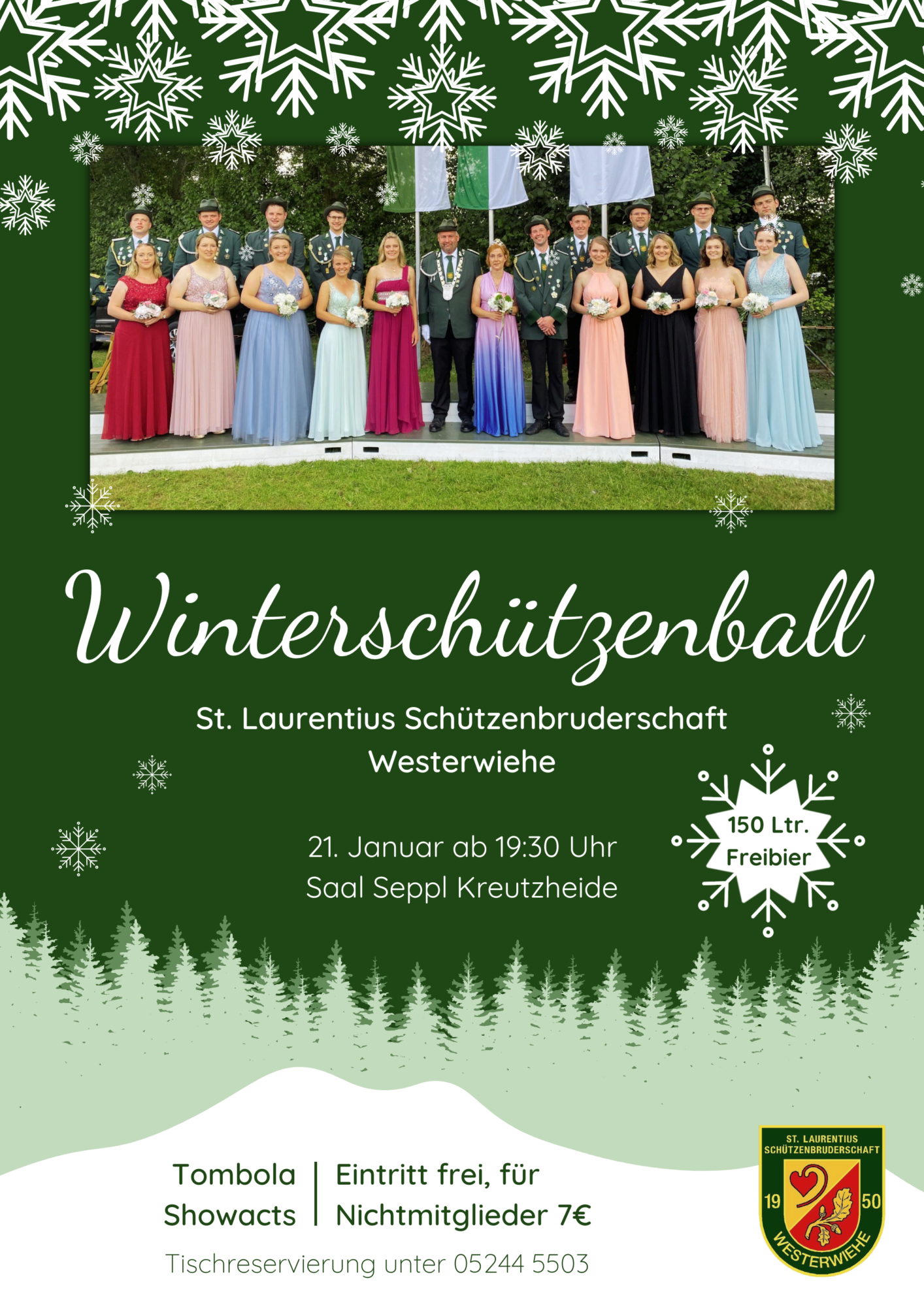Die St. Laurentius Schützenbruderschaft lädt zu ihrem Winterschützenball am Samstag, den 21. Januar 2023 ab 19:30 Uhr in den Saal Seppl Kreutzheide ein.